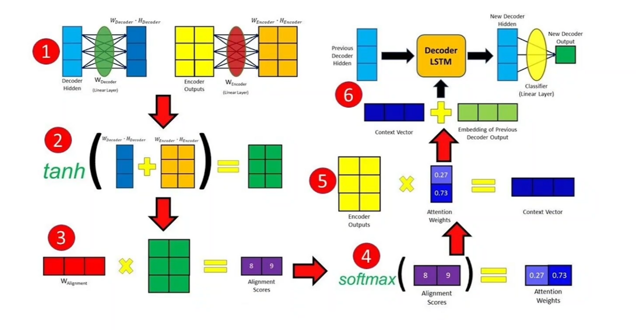 - 기존의 문제점 -> Encoder-Decoder 아키텍쳐의 경우에 Decoder에 들어가는 input이 번역하기전 단어들 ,즉 How was your day의 Encoding을 거친 Context vector를 모두 거쳐 "마지막" hidden state만 Decoder의 input으로 들어가는 문제점이 있다. 이게 왜 문제점이냐 하면은 순서대로 가정했을때 How-> comment , How was -> se , How ,was your -> passes 이런식으로 output이 나오게되는데 어순이 다를경우 순서대로 존재하지 않고 원하는 결과의 초점을 맞추기가 어려웠다