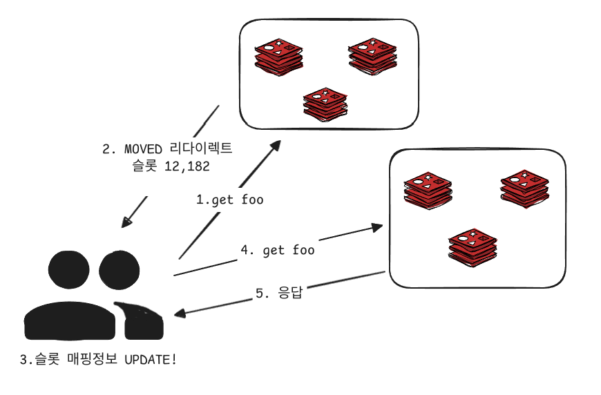 - 클라이언트가 MOVED 리다이렉트를 받고 로컬 슬롯 매핑을 업데이트함