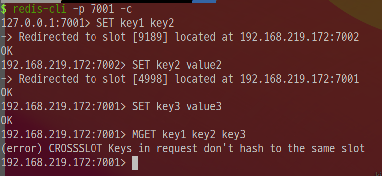 어떤 키에 값을 저장할 때는 해당 키 이름을 해싱하여 어느 슬롯에 데이터를 저장할지 결정한 후 해당 슬롯을 가진 샤드에 데이터가 저장된다. 레디스 클러스터는 데이터의 일관성과 높은 성능을 제공하기 위해 MSET과 같이 여러키를 동시에 조작하는 명령어나 이페머럴 스크립트를 실행할 때 모든 키가 동일한 슬롯에 있어야 한다. 만약 다른 슬롯에 있는 키에 접근하려고 하면 CROSSSLOT 오류가 발생한다.