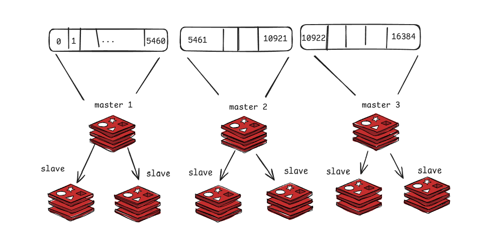 레디스 클러스터는 각 샤드마다 하나의 마스터 , 0개 이상의 레플리카를 가지며 16384개의 슬롯이 각 샤드에 분배된다. 레디스 클러스터에 분배되는 키는 CRC16 해시함수를 사용하여 해시값을 계산하며 그 값을 16384로 나눈 나머지를 구하고 해당값의 슬롯을 가진 샤드는 요청을 처리하게 된다.