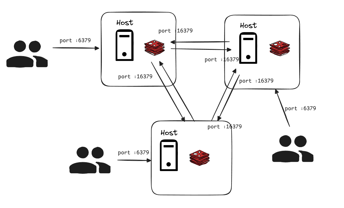 레디스 클러스터를 연결하기 위해서는 2개의 TCP 포트를 사용한다. 첫번재는 클라이언트로부터 TCP 연결을 받는 포트로 기본값은 6379이다. 두 번째는 클러스터 내부통신을 위한 포트로, 기본값에 10000을 더한 포트를 사용한다. 이를 cluster bus port라고 한다