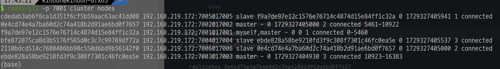 다음 명령어로 cluster가 잘 mapping 되었는지 확인할 수 있는데 mapping이 되지 않았다면 fail?, fail, 혹은 node가 1개뿐인 상황이 발생할 수 있으니 제대로 확인을 해야 한다.