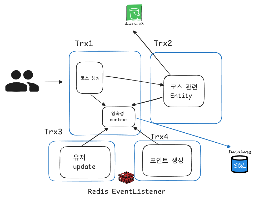위의 로직은 하나의 API에서 코스 객체 생성, 코스 연관 객체 3개 생성, 코스 저장, 유저정보 업데이트 등으로 이루어져 있다.