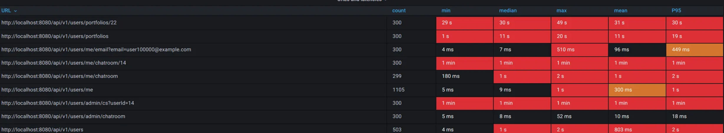 Observavility를 구성하고 Stress테스트를 통해서 서버를 최적화 한 결과 거의 100배의 요청수준에도 더 적은 request duration을 보여주며, 성능을 매우 높게 끌어올릴 수 있었다.