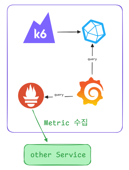 CPU, Memory등 각 서비스의 JVM Metric은 Prometheus에서 서비스에 접근해 Metric을 수집하게 된다. 그리고 Influxdb는 k6에서 테스트 결과를 influxdb에 보내게 되고 grafana에서 이를 받아 시각화를 진행한다.
