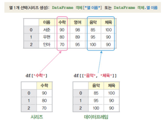 - 열 → 시리즈 객체 #각 열은 공통의 속성을 가져야함