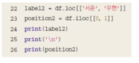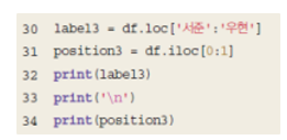 - 단, 인덱스 이름을 범위로 지정한 label3의 경우에는 범위의 마지막 값인 '우현' 학생의 점수가 포함되지만, 정수형 위치 인덱스를 사용한 position3에는 범위의 마지막 값인 '우현' 학생의 점수가 제외된다