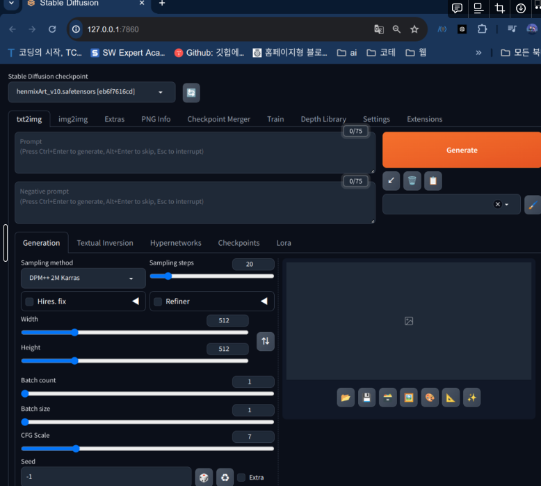 2. 기본적인 WebUI메뉴 설명 : T2I : Text to Image
