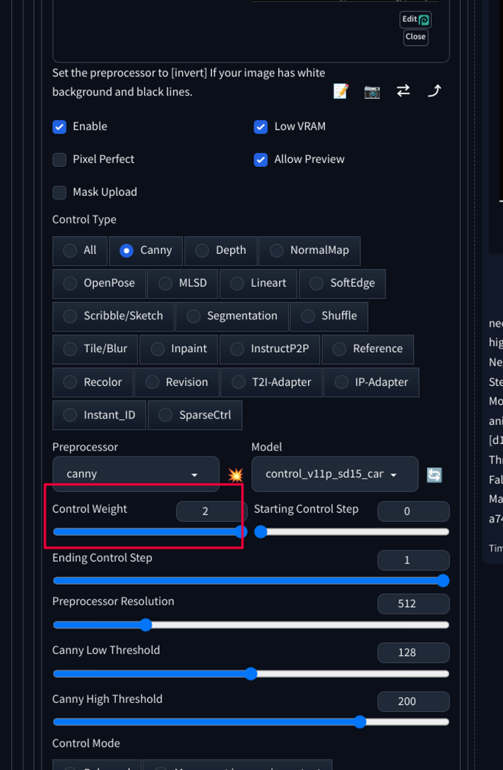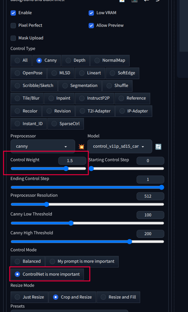 - 내 Controlnet 설정이 더 중요하게 작용해서 이미지를 생성해달라는 설정입니다.