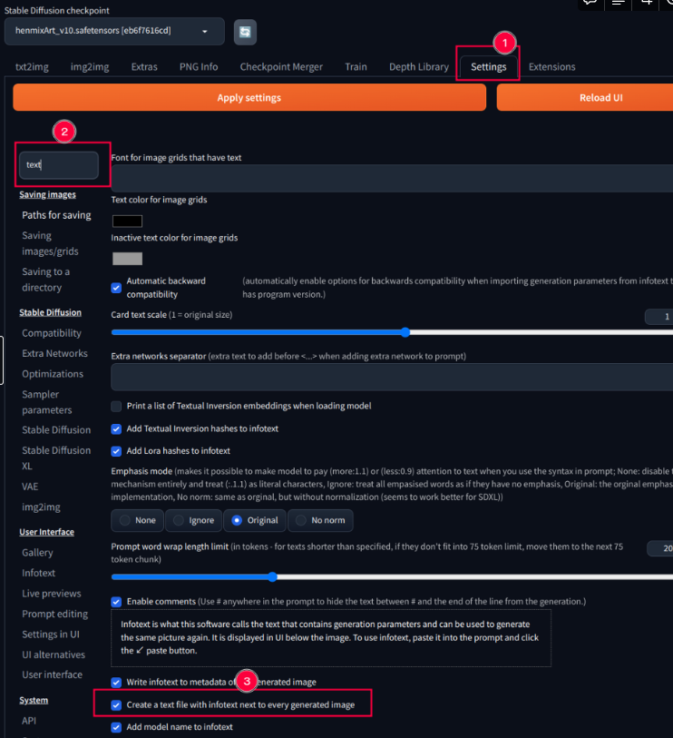 - Setting 들어가서 text 검색후 이미지 생성마다 prompt에 대한 text를 저장해주는 것 선택!