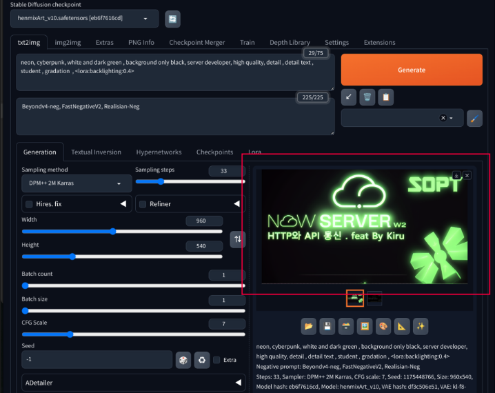 - 적절한 prompt나 Lora를 추가해서 다양하게 만들어볼수 있습니다! 혹은 checkpoint를 변경한다거나?